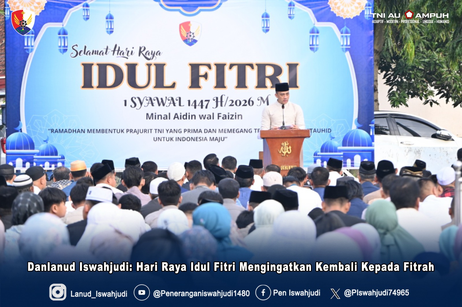 Demikian yang disampaikan Danlanud Iswahjudi Marsma TNI Muchtadi Anjar Legowo, M.S., M.Han., sebelum Shalat Idul Fitri 1447 Hijriah di halaman Masjid Al Ukhuwwah Lanud Iswahjudi, Madiun. Sabtu (21/3/2026).