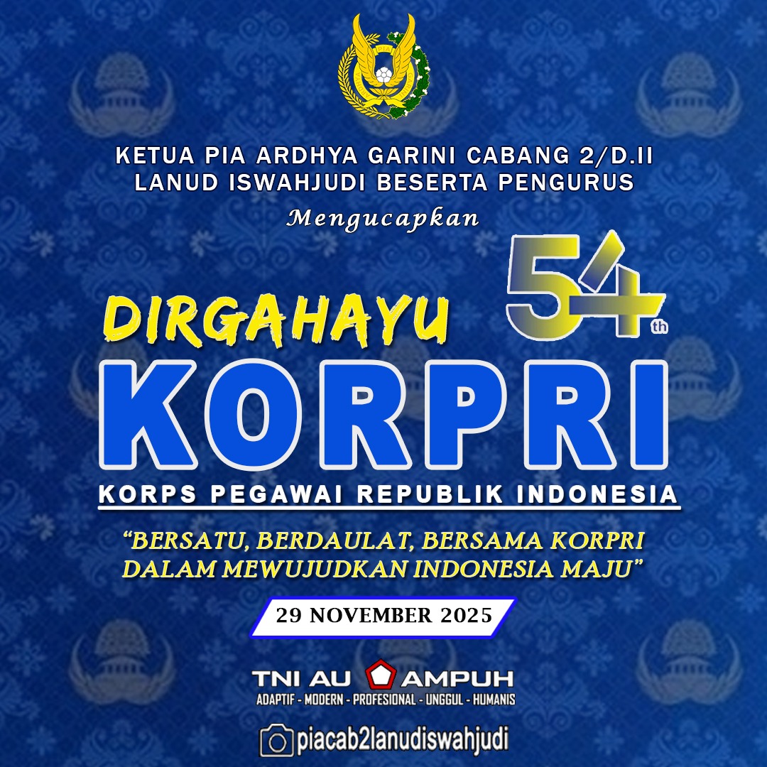 DIRGAHAYU KORPRI ” BERSATU, BERDAULAT, BERSAMA KORPRI DALAM MEWUJUDKAN INDONESIA MAJU”Home2025November29 by Pen Lanud Iswahjudi kapeniwj@tni-au.mil.id 29 November 2025 0 4 bulan HUT Navigasi pos Previous postNext post Tinggalkan Balasan Batalkan balasanAlamat email Anda tidak akan dipublikasikan. Ruas yang wajib ditandai *Komentar * Nama * Email * Situs Web Simpan nama, email, dan situs web saya pada peramban ini untuk komentar saya berikutnya.