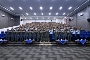 Kepala Staf TNI Angkatan Udara Marsekal TNI Mohamad Tonny Harjono melaksanakan foto bersama dengan Peserta latihan Mission Oriented Training (MOT) 2025 di Gedung ACMI Fox 3 Lanud Iswahjudi.