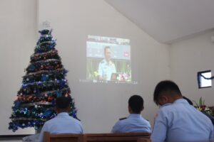 Secara online, personel Lanud Iswahjudi mengikuti Ibadah Perayaan Natal Bersama TNI Angkatan Udara Tahun 2025 di Gereja Kristen Protestan Oikumene (GKPO) Lanud Iswahjudi, Madiun. Rabu (4/2/2026).