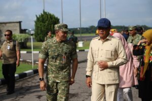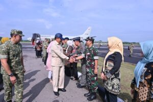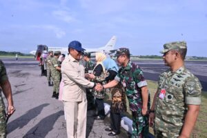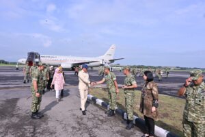 MADIUN, LANUD ISWAHJUDI. Danlanud Iswahjudi Marsma TNI Mucthadi Anjar Legowo, M.S., M.Han., didampingi Ketua PIA Ardhya Garini Cabang 3/D.II Lanud Iswahjudi Ny. Ina Anjar Legowo menyambut kedatangan Wakil Menteri Pertahanan Republik Indonesia (Wamenhan RI) Marsekal TNI (Purn) Donny Ermawan T., M.D.S., M.S.P., dan Penasihat 2 DWP Kementerian Pertahanan RI Ny. Yayuk Donny Ermawan di Main Apron Lanud Iswahjudi, Madiun. Selasa (20/1/2026).